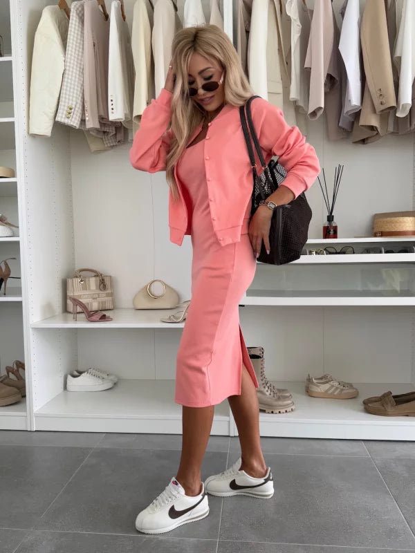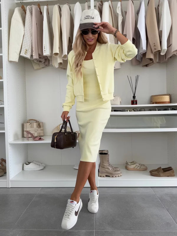 Karin | Fitilli Triko Midi Elbise & Bomber Ceket Takımı, rahat şıklıkla feminen zarafeti bir araya getiriyor. Vücuda oturan midi elbise silüetinizi nazikçe sararken, sportif bomber ceket modern bir dokunuş katıyor. İster ofiste ister şehirde bir gün geçirirken olun, bu set tarzınızı bir üst seviyeye taşıyor.