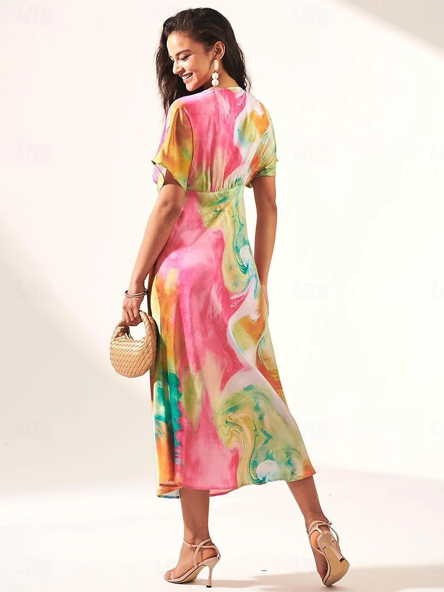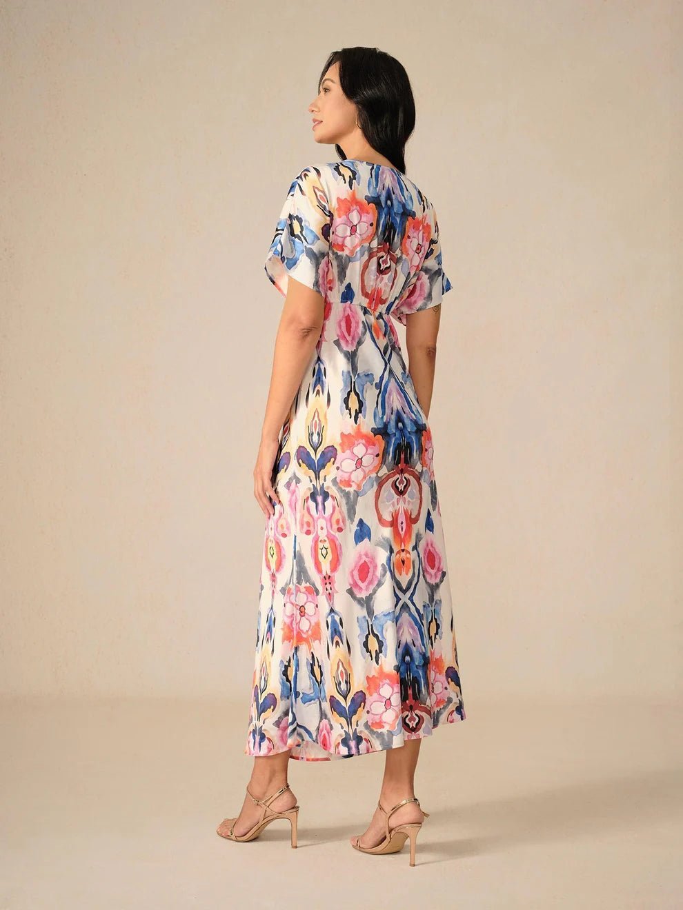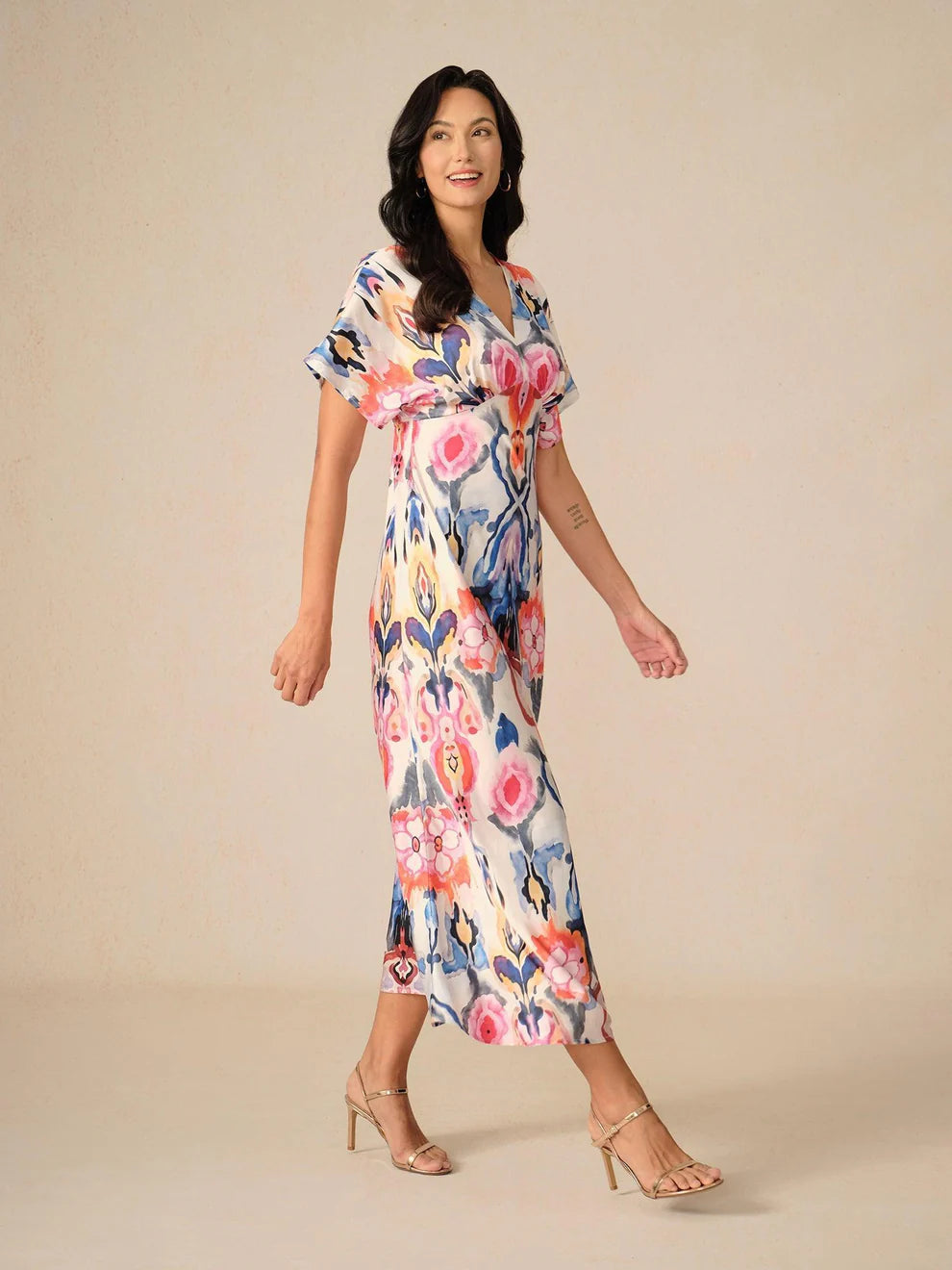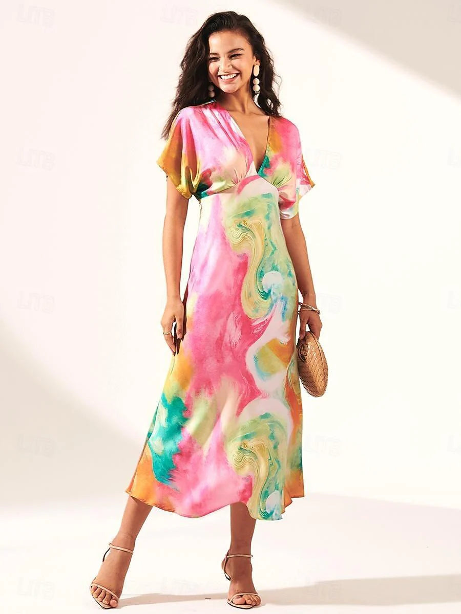 Bu zarif saten maxi elbise, canlı soyut deseni ve vücuda uyum sağlayan saran kesimiyle her bedende göz alıcı bir siluet sunar. Kollarındaki dökümlü yapı ve akışkan formu sayesinde hafif, zarif ve özgür bir his yaratır. Parlak saten kumaşı lüks bir dokunuş katarken; yaz davetleri, akşam yemekleri ve özel etkinlikler için ideal bir tercih haline gelir.